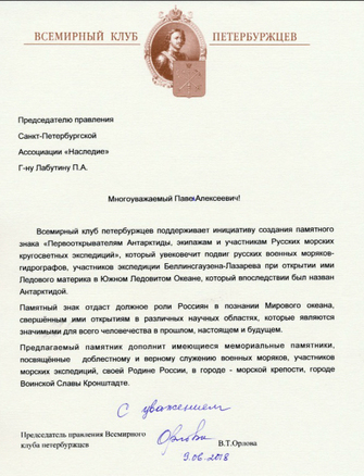 Минприроды РФ во исполнение поручения Президента Российской Федерации от 20.10.2015 г. направило заинтересованным ведомствам и учреждением письмо от 30. 12. 2016 г. № 04-14-53/36308, в приложении к которому (п. 2.19) предусматривается разработка памятника посвящённого «200-летию открытия Антарктиды» (см. приложение № 3)
